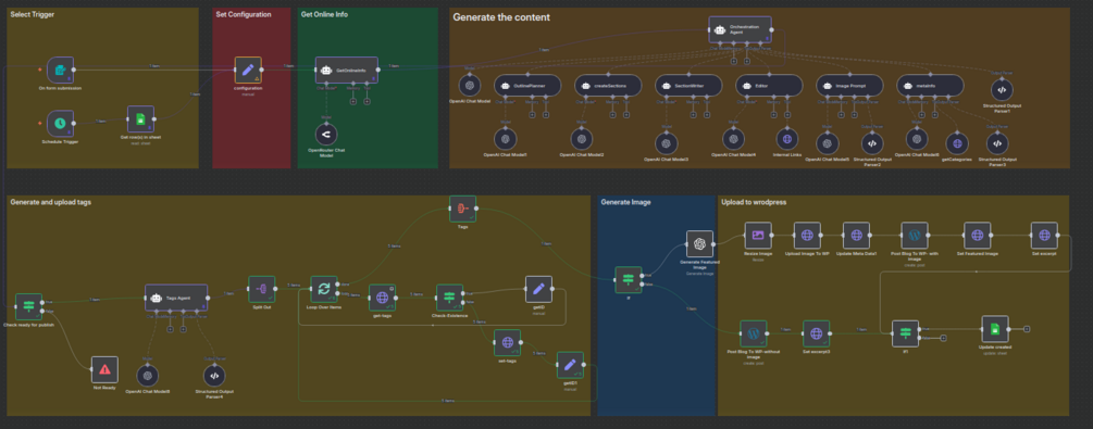 The system accepts blog parameters either from a form submission or from a Google Sheet row (via scheduled trigger), dynamically fetches WordPress categories, and produces a complete, publication-ready post through an orchestrated sequence of GPT-5 agents.